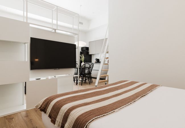 • Semi-private bedroom with a queen-size bed (1.60 m), located in the main space and delimited from the living room by a rotating TV furniture.